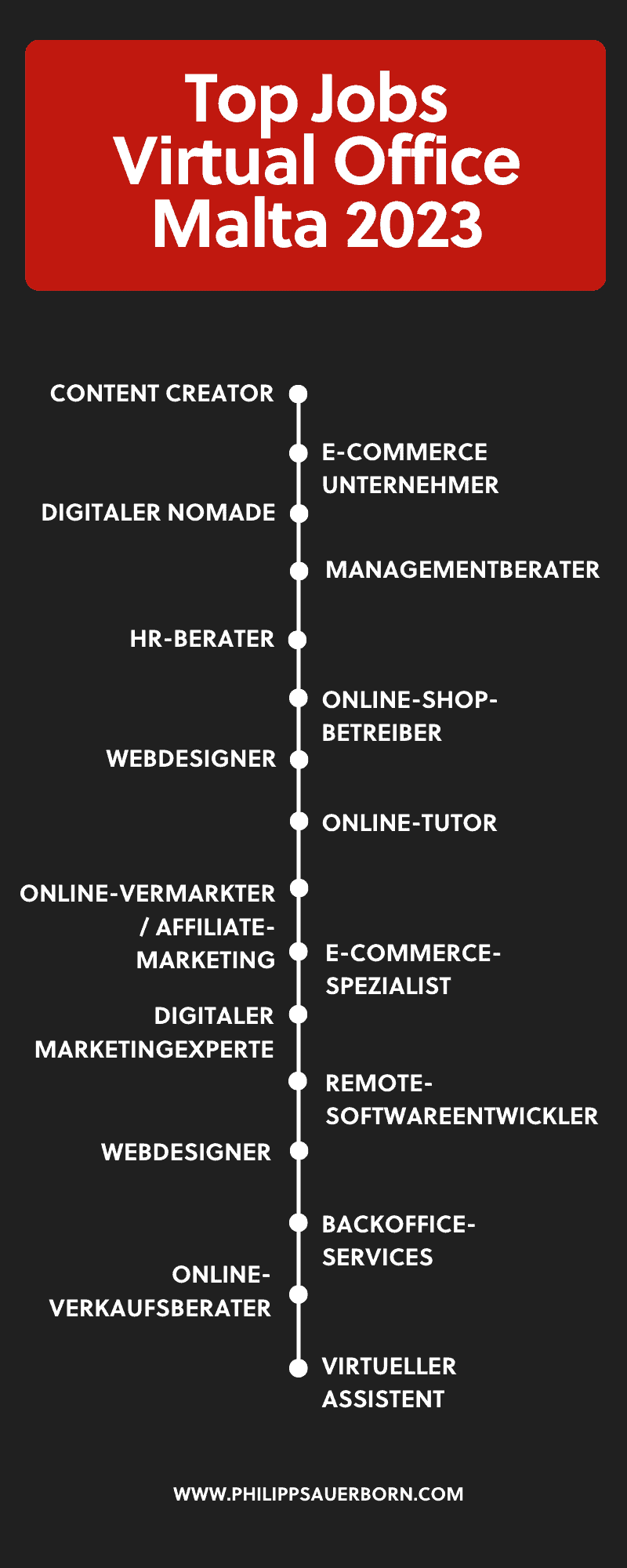 Mittlerweile ist diese Liste wahrscheinlich sogar stereotypisch, da nahezu jede Tätigkeit online oder nur mit Internetzugang ausgeübt werden kann. Gerade diejenigen, die nach Malta kommen, bieten in den meisten Fällen etwas Digitales an. Daher überlegen sie genau, ob sie ein physisches Büro mit monatlicher Miete betreiben sollten oder nach einer passenderen Lösung suchen. Nach einer moderneren und vor allem kostengünstigeren Arbeitsweise auf Malta, wenn sie dort sind.